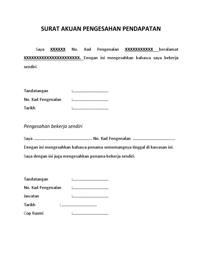 Contoh surat pengesahan pendapatan bagi individu yang tidak mempunyai slip gaji.